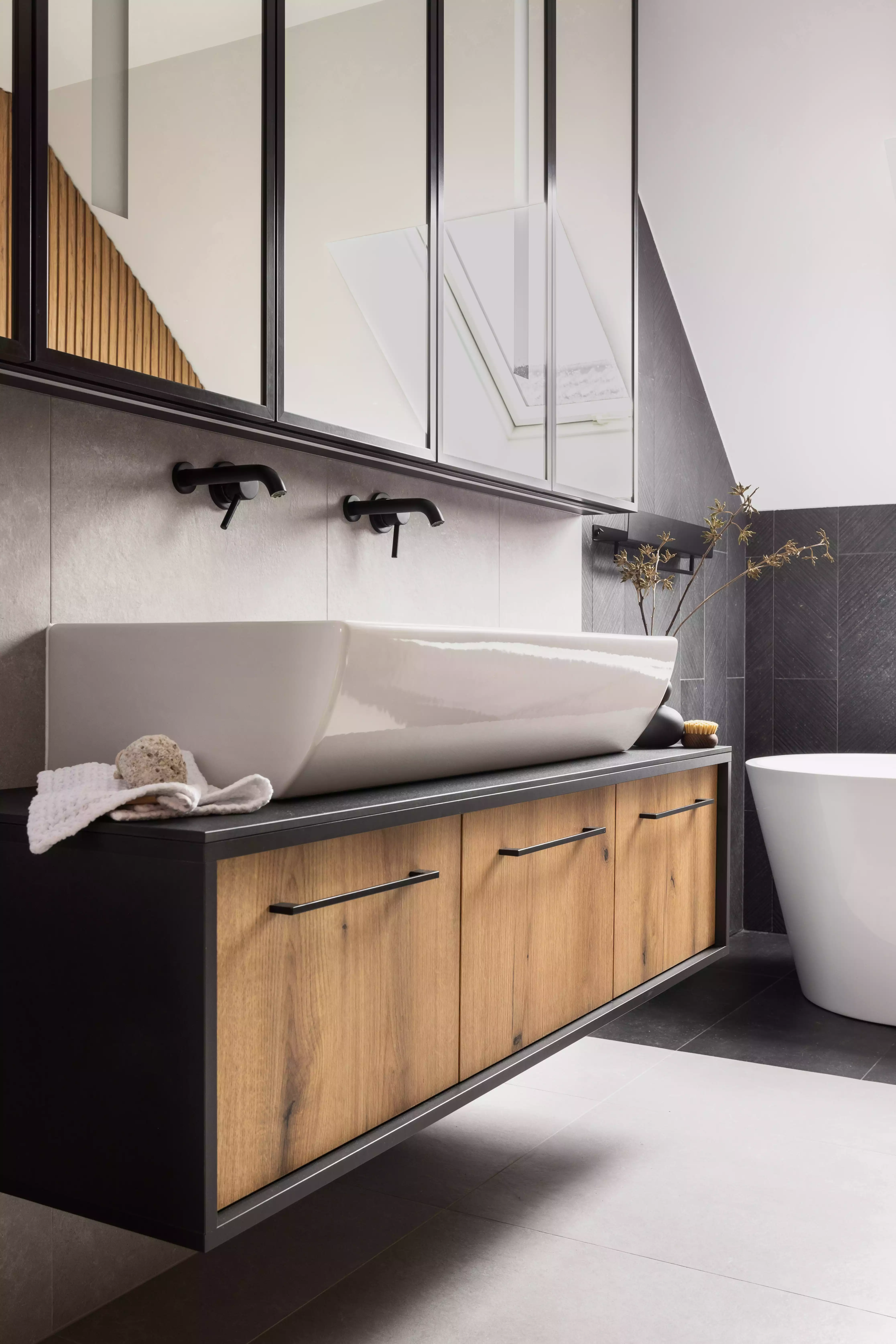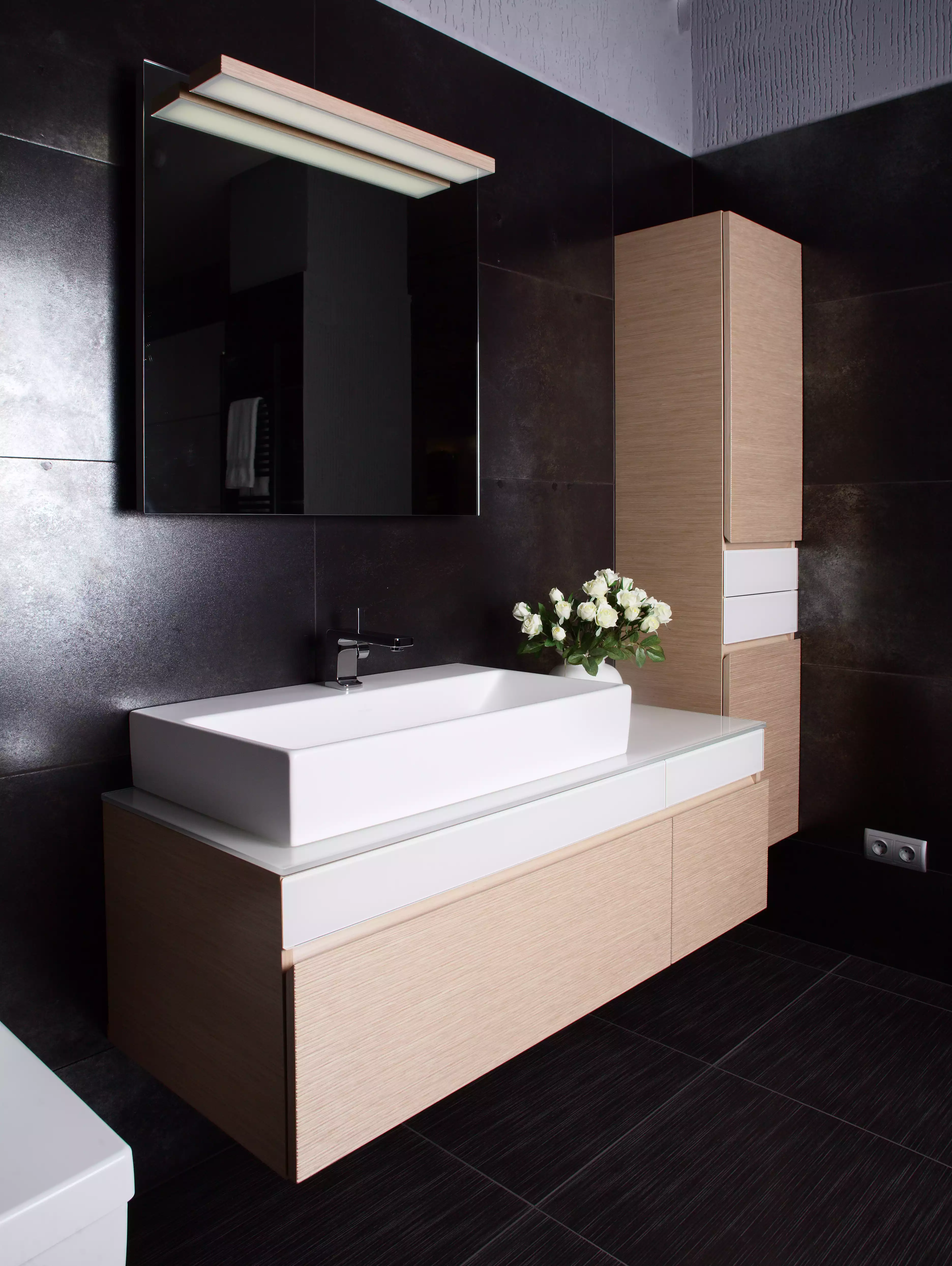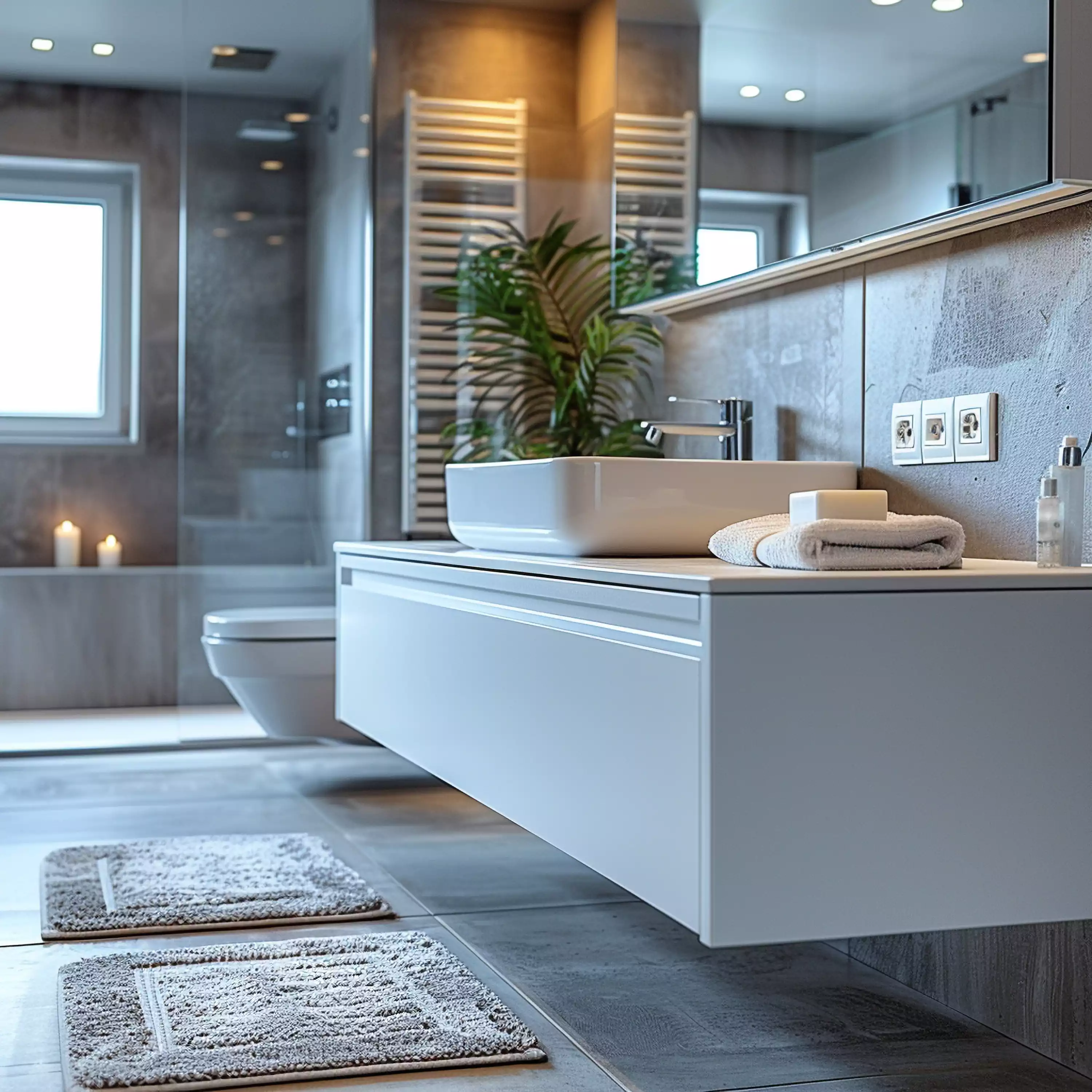Banyonun planlamasında hem görsel bütünlük hem de depolama ihtiyacı gözetildi; detaylarda konforu artıran çözümler tercih edildi.